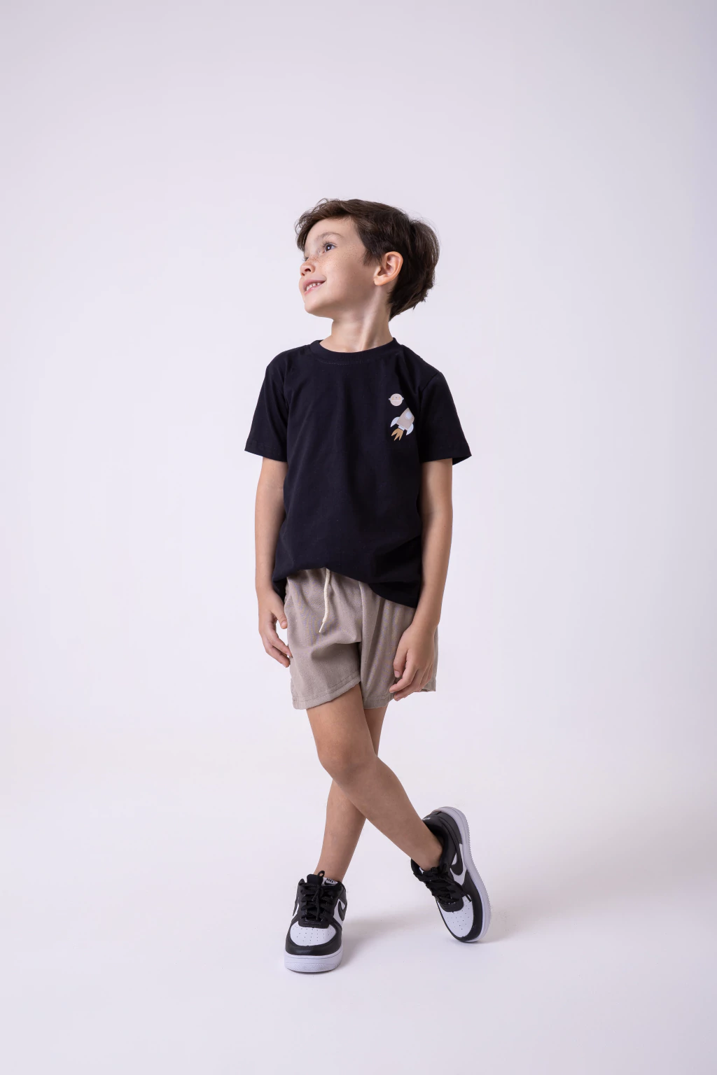 O short em tom neutro completa o conjunto com equilíbrio e conforto, tornando a peça perfeita para o dia a dia, brincadeiras e momentos de descoberta, sempre com muito estilo e liberdade de movimento.
